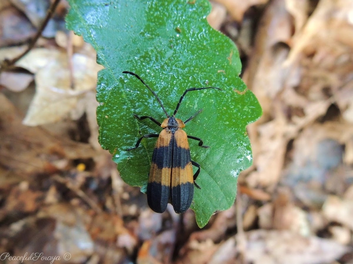 Its head almost completely hidden under an orange. Adults are active during the day, and lay their eggs on dead/decaying trees. Guide is a work in progress. Beetles of this family are elongated and usually found on flowers or stems. This orange and black beetle somewhat resembles a firefly, but it does not have bioluminescence.